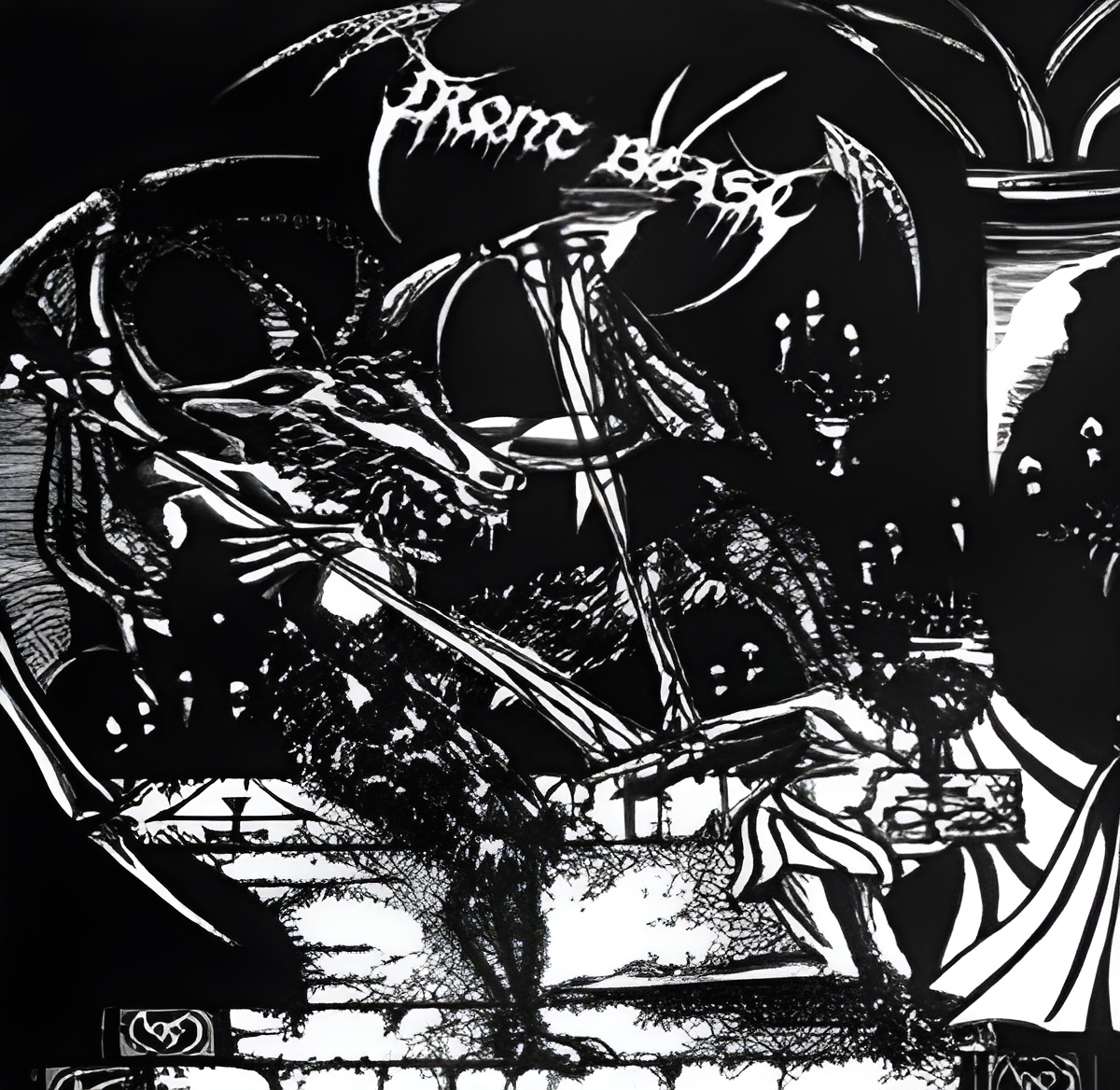 As we flip the record we find the German blackmetal act Front Beast. This is actually a one-man project led by Evil Avenger who is also active in the old school thrash band Nocturnal and run the old school label Deathstrike Records (this EP is released through his own label as well). Evil Avenger has displayed his deepest desires to maintain the old school feeling of metal the way it was played in the 80’s in every release he did, both with his bands as on his label. This one lengthy track which is pressed on his side of the vinyl is quite eerie and raw blackmetal. Complete with the nihilistic feeling (the title refers to it as well), howling screams, simple drums and the raw riffs. Eerie blackmetal which isn’t that original, but very interesting?