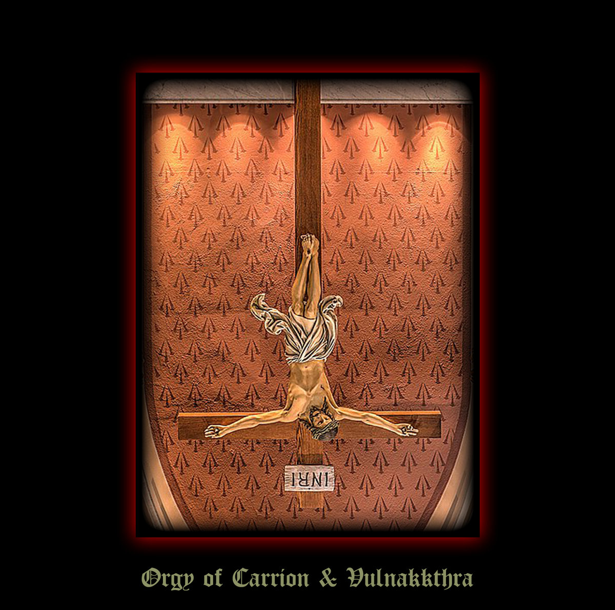 Over the years Orgy Of Carrion has always been a bit of an enigma when it comes to their musical identity. While always dwelling in the rougher dimensions of the Black Metal genre, they have been able to surprise with their output. Sometimes they are rougher than a barbed wired anal fistfuck, but the next time they go into rather traditional territories. And when it comes to split they’ve always had a great taste in partnering up with like-minded quality acts. This newest addition to the ever-growing Orgy Of Carrion discography is no exception in the music that’s on offer and their partner for this split.